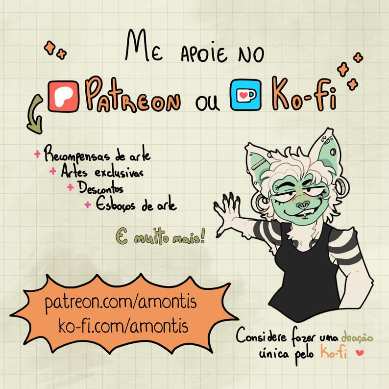 Se você tem interesse em ver minhas artes em primeira mão, arte em progresso, desenhos que eu não posto em redes sociais, speedpaints e recompensas de arte, considere me apoiar no Ko-Fi ou Patreon!!Caso você não queira se comprometer com pagamentos mensais, pode fazer uma doação única no Ko-Fi, ao doar, você estará me permitindo à continuar fazer o que eu amo e me ajudar a viver uma vida estável!